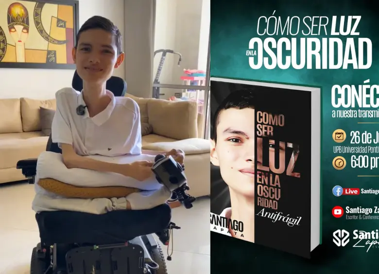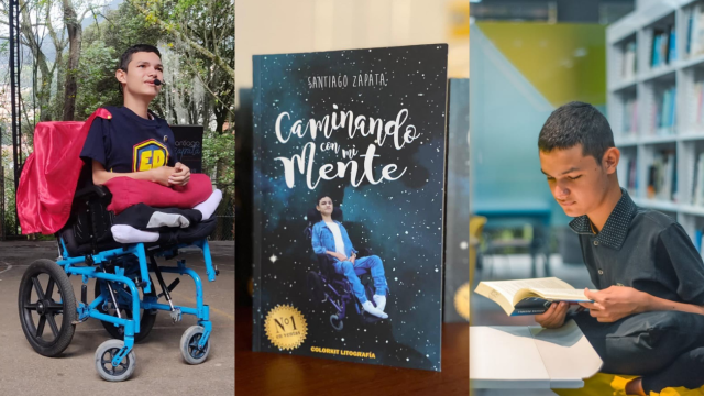 En el libro, Santiago comparte su historia de vida: diagnosticado con Distrofia Muscular de Duchenne, una enfermedad degenerativa que lo limita físicamente, pero él decide transformar su dolor, sus limitaciones y su sufrimiento en un mensaje de esperanza.
