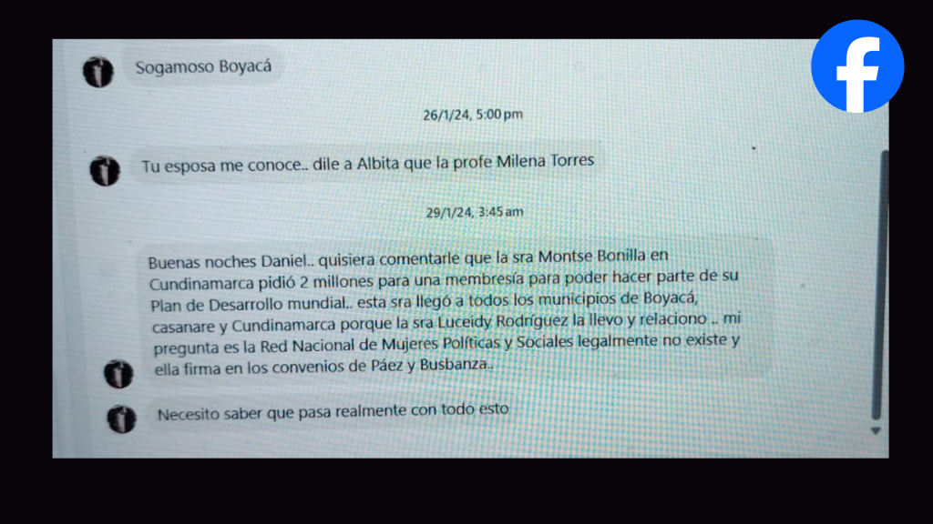 Una educadora de Sogamoso Boyacá, Milena Torres, manifestó que “La sra Montse Bonilla en Cundinamarca pidió 2 millones para una membresía para poder hacer parte de su Plan de Desarrollo mundial.. esta sra llegó a todos los municipios de Boyacá, casanare y Cundinamarca porque la sra Luceidy Rodríguez la llevo y relaciono .. mi pregunta es la Red Nacional de Mujeres Políticas y Sociales legalmente no existe y ella firma en los convenios de Páez y Busbanza..”